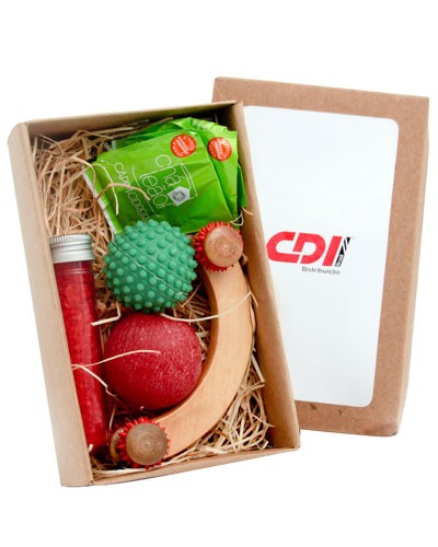 01 mini massageador em madeira emborrachada, 01 bolinha anti stress cravinho em borracha oca, 01 vela aromatizada cubo ou Bolinha, 01 frasco de sais de banho e 03 sachês de chá mate, embalados em caixa de papelão kraft com tampa personalizada.