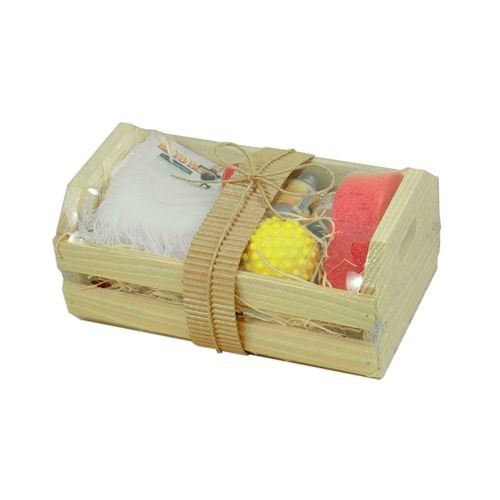 01 toalha de lavabo (30x48) cor branca / 03 frascos 30ml c/ tampa de metal rosqueável com Loção Hidratante, Espuma de Banho e Sabonete Líquido todos com essências naturais , 01 esponja de banho sem cordão (7x7x3) , 01 bolhinha anti stress Embalagem: Mini caixote de madeira de pinus,(20x12x09) Incluso faixa de papelão Microondulado com laço de ráfia. Personalização Laser ou Silk Screen no caixote , na toalha Transfer ou Bordado. Quantidade mínima: 100 kits