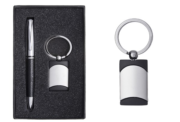 Estojo contendo 1 caneta metal/couro sintetico e chaveiro metalico