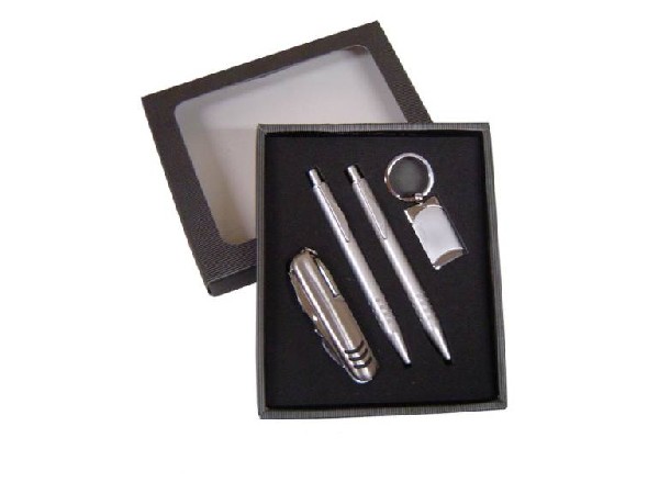 Estojo contendo: 1 caneta,1 lapiseira,1 canivete e 1 chaveiro