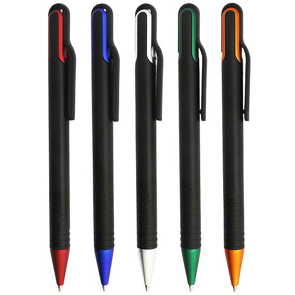 Caneta plástica inteira preta com laterais do acionador colorido. Detalhes em relevo na parte inferior. Aciona por giro.